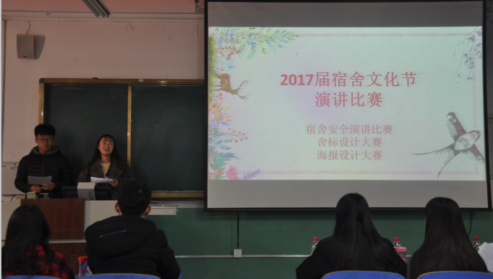 为营造良好宿舍文化氛围,加强宿舍成员安全意识,打造91大赛 特色文化宿舍,12月9日下午,由91大赛 团委主办,学生会宿管部、纪检部、卫生部联合承办的2017届宿舍文化节演讲比赛在文史楼315室举办,学生会主席团部分成员担任评委。