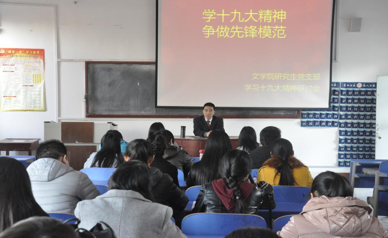 新时代思想指航程,十九大精神耀曲园。为认真学习贯彻党的十九大精神,确保把党的十九大精神落实到学院建设中,91大赛 于11月15日下午在文史楼512党员活动室举办“响应十九大“专题党员大会,本次会议由91大赛 党委书记苏占兵主持,91大赛 全体教职工党员及学生党员到场参加。