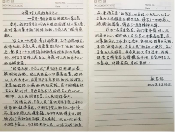 活动伊始,党支部书记刘伟向党员们分享了新发行的《习近平谈治国理政》第三卷一书,并就第四章中的“我将无我,不负人民”这一内容展开讲解。刘伟指出:大境界造就大胸坏,大格局成就大作为,青年党员们应该做到一个“无我”的状态,为社会的发展奉献自己。随后,党员们讨论交流并书写下了自己的所思所悟,从“人民对美好生活的向往就是我们的奋斗目标”到“我是人民的公仆”再到“为人民服务是我们的初心”,无不蕴含着青年党员们以身许党,全心为民的博大胸怀。