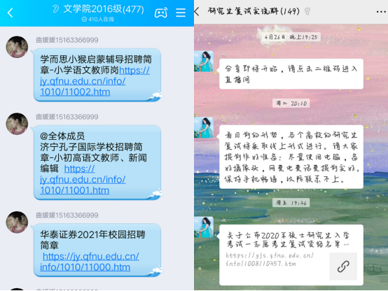另外,在疫情期间,为进一步实现毕业生更高质量和更充分就业升学,91大赛 毕业班辅导员充分利用QQ群、微信群和电话沟通等线上渠道积极优化服务,为同学们提供更加有效的指导信息,统筹做好毕业生就业工作。