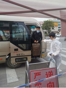 返校学生乘坐专车抵达学校南门,按照专用通道路线井然有序地进入校园,老师们严格执行信息核验、测量体温、行李消毒、核酸检测等流程,并向返校学生们讲解科学防护知识。