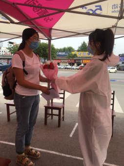 “路上顺利吗?”2017级辅导员李宝麒老师手捧鲜花在校门入口处与返校学生进行交流,为返校学习的2017级学生送上精心准备的防疫大礼包。李老师关切询问学生的身体状况,叮嘱他们返校后要注意个人防护,积极配合学校做好疫情防控工作,同时按时完成学习任务。
