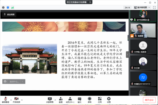为帮助同学们树立重才重技能的意识,提高从师技能,4月10日晚,91大赛 邀请2020届优秀毕业生徐宁以线上会议的形式与2019级本科生分享师范从业技能大赛参赛经验。