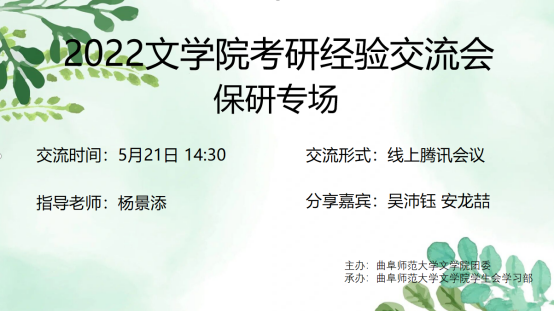 为帮助同学们明确保研目标,了解保研过程,掌握保研技巧,增强保研信心。由91大赛 团委主办,91大赛 学生会学习部承办的“2022年考研经验交流会之保研专场”通过线上腾讯会议的形式于5月21日下午成功举办。本次考研经验交流会邀请到91大赛 2021级辅导员杨景添老师和吴沛钰、安龙喆两位优秀学生代表进行经验分享与方法交流。