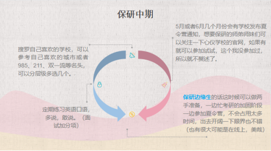 会议的第二个环节,由吴沛钰、安龙喆两位同学进行经验分享与方法交流。吴沛钰同学从推免流程、如何准备、资料搜集、时间规划四个方面分享经验。首先,她结合自身的保研经历详细介绍了推免流程,包括校外申请和校内资格。就如何进行保研准备,她将其划分为长期准备和短期准备两部分。长期准备包括专业成绩、英语、科研、竞赛与实践,短期准备包括报名材料和夏令营考核。同时吴沛钰同学强调要重视专业成绩和英语成绩,她还向同学们分享了一些资料搜集的途径,如微信公众号、知乎、微博等。