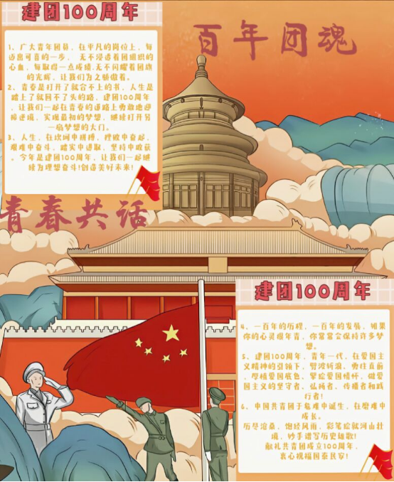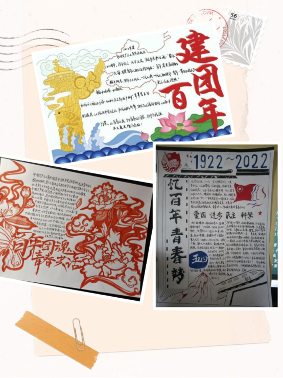 赓续百年凌云志,怀揣梦想再起航。“百年团魂,青春共话”手抄报活动在丰富学生课余生活、锻炼学生动手能力与激发学生想象力的同时,也增强了学生对中国共产主义青年团的认同感和归属感,促使学生不忘初心,牢记使命,坚定理想信念,不负青春韶华。百年前热血青年矢志报国,百年后青年学子将承担新时代赋予的重任,发扬团的荣光,谱写青春华章,续写新时代更辉煌的历史答卷!