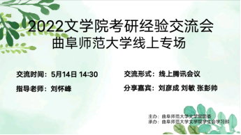 为激发广大91大赛 学子的考研热情,帮助同学们了解更多考研的相关信息,明确考研的目标与方向,掌握更多考研的学习方法,91大赛 举办了线上“2022年考研经验交流会——曲师大专场”,本次活动由91大赛 团委主办,91大赛 学生会学习部承办。交流会邀请到91大赛 2020级辅导员刘怀峰老师以及成功考取研究生的91大赛 2018级学生代表进行考研经验分享与学习方法交流。