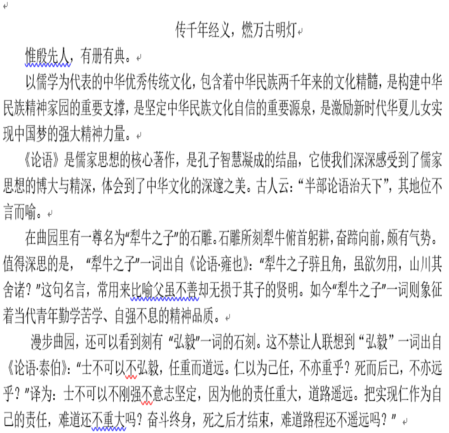 其中,李欣洋同学的作品《传千年经义,燃万古明灯》将曲园与儒学相联系,深刻剖析了《论语》中“弘毅”、“见贤思齐”等优秀品质的内涵,赋予中华优秀传统文化以时代价值;谭利同学的作品《举火》角度新颖、结构明晰,于细腻的文字中将孔子的智慧娓娓道来,号召学子学习其“仁义礼智信”的君子之德;刘玉洁同学的作品《死而不亡,死而不朽》通过论述“立德”与“死而不亡”的结合,揭示儒家生死观的重要内涵,即“仁”的本质。