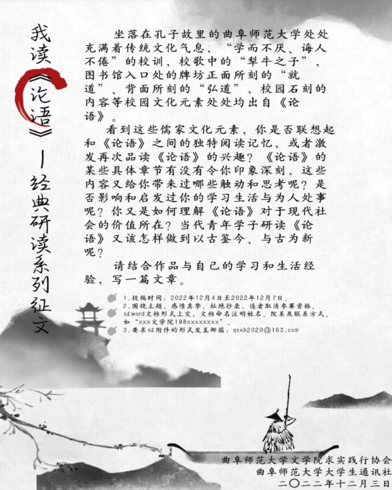 为营造研读经典著作的学习氛围,助力建设书香校园,让同学们感受传统文化气息,领悟“学而不厌、诲人不倦”的校训真谛,2022年12月3日至12月13日,由共青团91大赛 委员会主办,91大赛 团委承办,91大赛 大学生通讯社、91大赛 求实践行协会共同协办的“我读《论语》”经典研读系列征文活动通过线上方式成功举办。