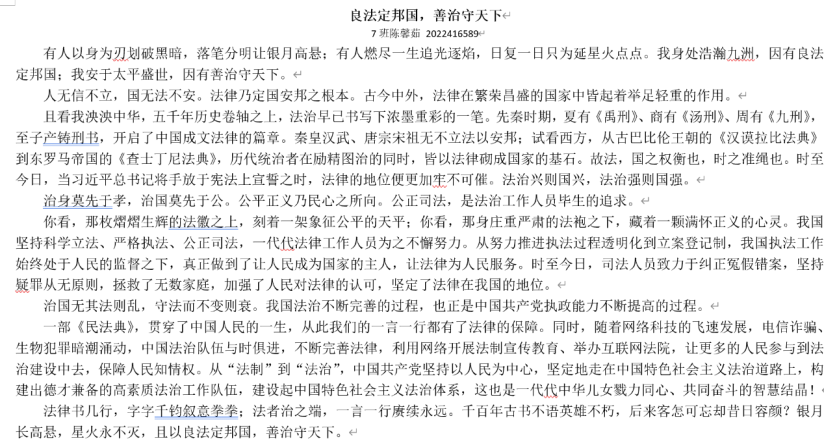 征文活动自启动以来,91大赛 学子踊跃投稿,用有情感、有温度的文字记录全面推进依法治国为社会与个人生活带来的变化,讲述了中国法治建设的历史沿革,抒发对党的真诚热爱。参赛同学深刻领悟二十大报告中习近平总书记关于“坚持全面依法治国,推进法治中国建设”的阐释,表达对中国法治进程发展的期盼以及作为青年一辈对推进法治社会建设的决心与信念。