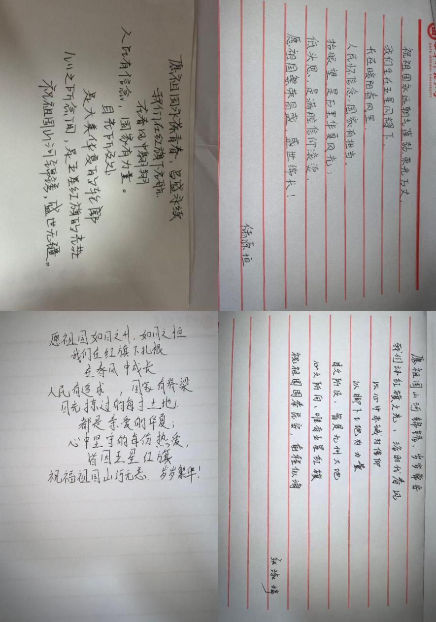 在实践行动中,各支部学子同样以多种形式展现青年担当。2024级1班团支部开展“三行寄心语”书信征集活动,同学们以简洁真挚的文字书写对祖国的深情告白;2024级4班团支部组织“云打卡红色足迹”,借助线上资源探访革命遗址与纪念馆,并通过心得分享深化学习感悟;2024级6班团支部走进红色教育基地,通过观摩历史文物、图文及影像资料,在沉浸式学习中强化历史认同;2024级8班、9班团支部则积极开展“与国旗同框”活动,以影像为媒表达对祖国的热爱与祝福,展现新时代青年的精神风貌。