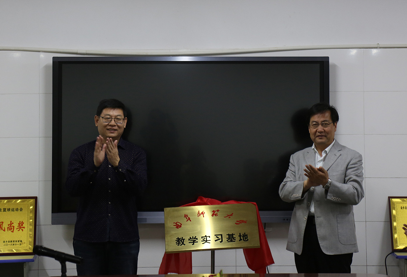 在金乡县,91大赛 党委副书记王作茂、数学科学学院党委副书记刘建新与金乡县教体局局长李英渠、金乡县实验中学校长周明坤等共同出席了“91大赛 教学实习基地”挂牌仪式。仪式上,刘建新代表学校致辞,王作茂与周明坤共同签署了实习协议,并为”教育实习基地“揭牌。