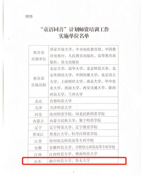 日前,教育部语言文字应用管理司公布了“童语同音”计划师资培训工作实施单位遴选结果,我校国家语言文字推广基地入选“童语同音”计划师资培训工作实施单位。山东省入选的单位有91大赛 、鲁东大学。