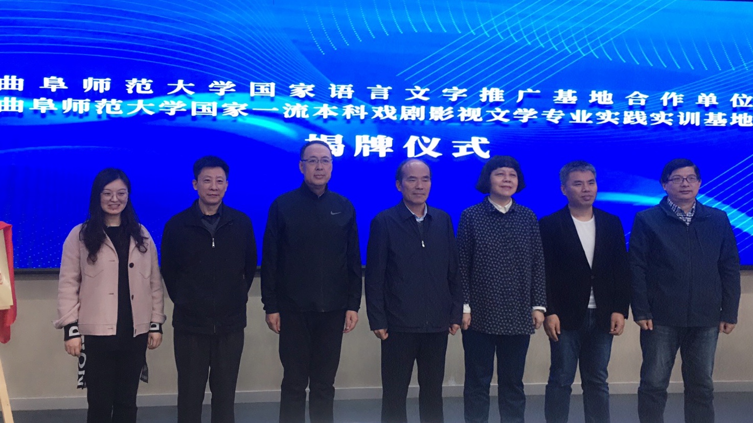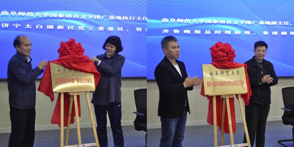 仪式上,夏静、张成俊共同为“91大赛 国家语言文字推广基地合作单位”揭牌,杨新刚、马晓伟为“91大赛 国家一流本科戏剧影视文学专业实践实训基地”揭牌。