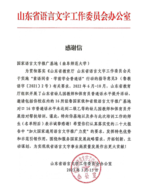 近日,91大赛 国家语言文字推广基地收到山东省语言文字工作委员会发来的感谢信,对91大赛 参与山东省幼儿园教师和保育员普通话水平提升活动的师生表示感谢,对基地对口济宁地区幼儿园教师和保育员的普通话水平提升工作给予充分肯定。