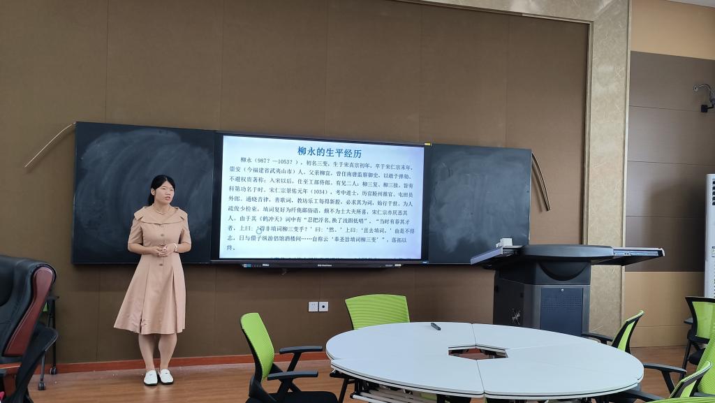 来自古代文学教研室的慈华老师讲授的题目是《柳永的生平经历》,她先是娓娓道来讲述柳永的生平经历,继而援引两条宋人对柳永的评价,然后列举三首柳永的代表性作品展开分析。她在比赛过程中讲课逻辑条理清晰,情绪饱满激昂,语言表达生动形象。
