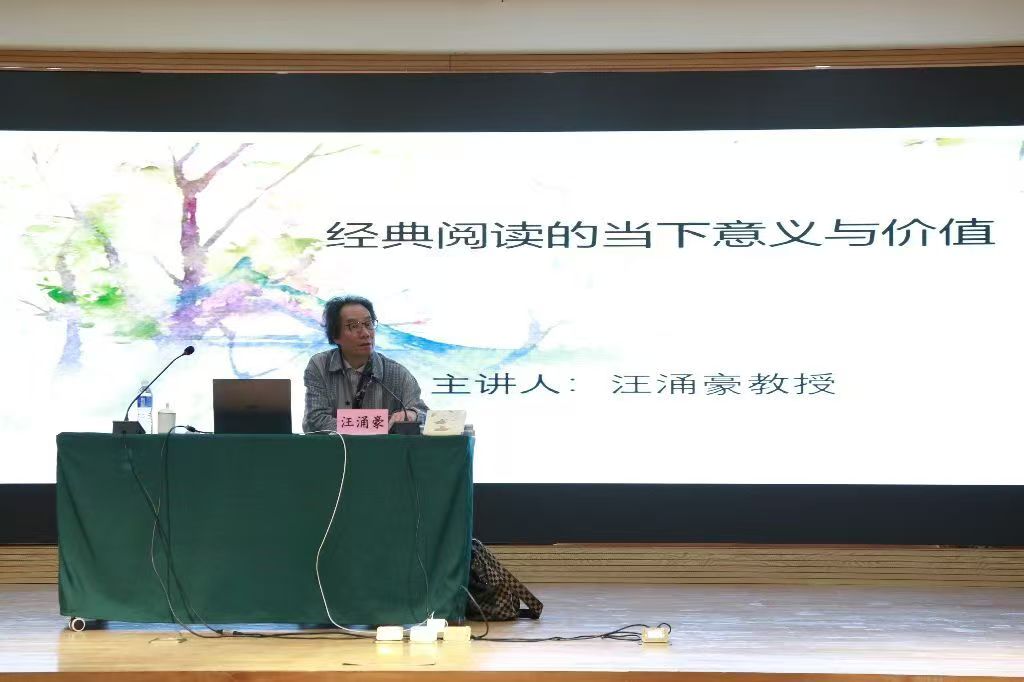 在《经典阅读的当下意义与价值》报告中,汪教授从“读图、读网与‘浅阅读’危机”、“何谓经典”、“经典阅读的意义与价值”和“阅读观念的树立”四个方面全面、系统、深入地阐释了经典阅读的当下意义与价值。他指出:“不能仅将经典局限在古今中外的文学名著上,许多人文社科类著作,包括一部分自然科学著作,因对人的处境有真切的关心,对人生在这个世界上的命运有深刻周彻的肯认,对人内心经验有感同身受的体谅,并精鹜八极、鞭辟入里,也都是经典,都应成为我们阅读的重点。”他认为经典阅读“有对普遍性和本原特征的热切关注,能助人了解世界,观照自我,因此提供给人的是切切实实的精神养料”,“经典阅读是一个沉静与沉思的过程,在这种沉静沉思中,我们不仅使书中文字活起来,充实我们,还使它因我们的理解得到延展与增值”。他强调“只有悠闲自得同时越然功利之上的人,才能真正读取这个世界最杳渺的真谛,并保持阅读最高上的品质”,“在经典阅读中,我们能够与“伟大的心灵相遇”,体会“久已失传的乐趣”,真正“认识你自己”。