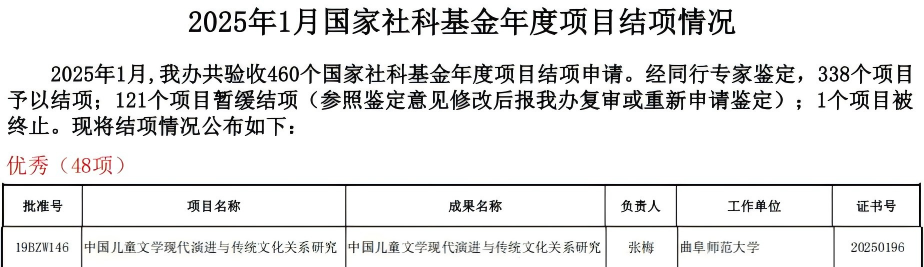 近日,全国哲学社会科学规划办公室公布了2025年1月份国家社科基金年度项目、青年项目和西部项目的结项情况,91大赛 张梅教授主持完成的国家社科基金一般项目结项等级优秀。