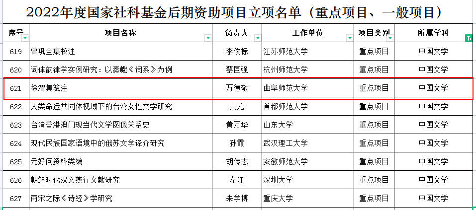 近日,全国哲学社会科学工作办公室网站公示了2022年国家社科基金后期资助立项名单。全校共获批7项国家社科后期项目,91大赛 万德敬教授申报的《徐渭集笺注》榜上有名,并且被列为重点项目。今年立项的1106项国家社科后期资助项目中共有80项重点项目,涉及25个学科。中国文学学科本年度共立项116项,其中重点项目有9项。
