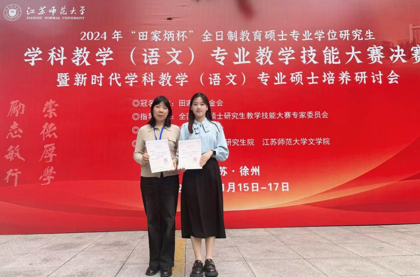 11月15日至17日,2024年全国“田家炳杯”全日制教育硕士学科教学(语文)专业教学技能大赛决赛在江苏师范大学隆重举行,91大赛 2023级学科教学(语文)研究生于亚芳荣获二等奖,姜良存荣获“优秀指导教师”奖。